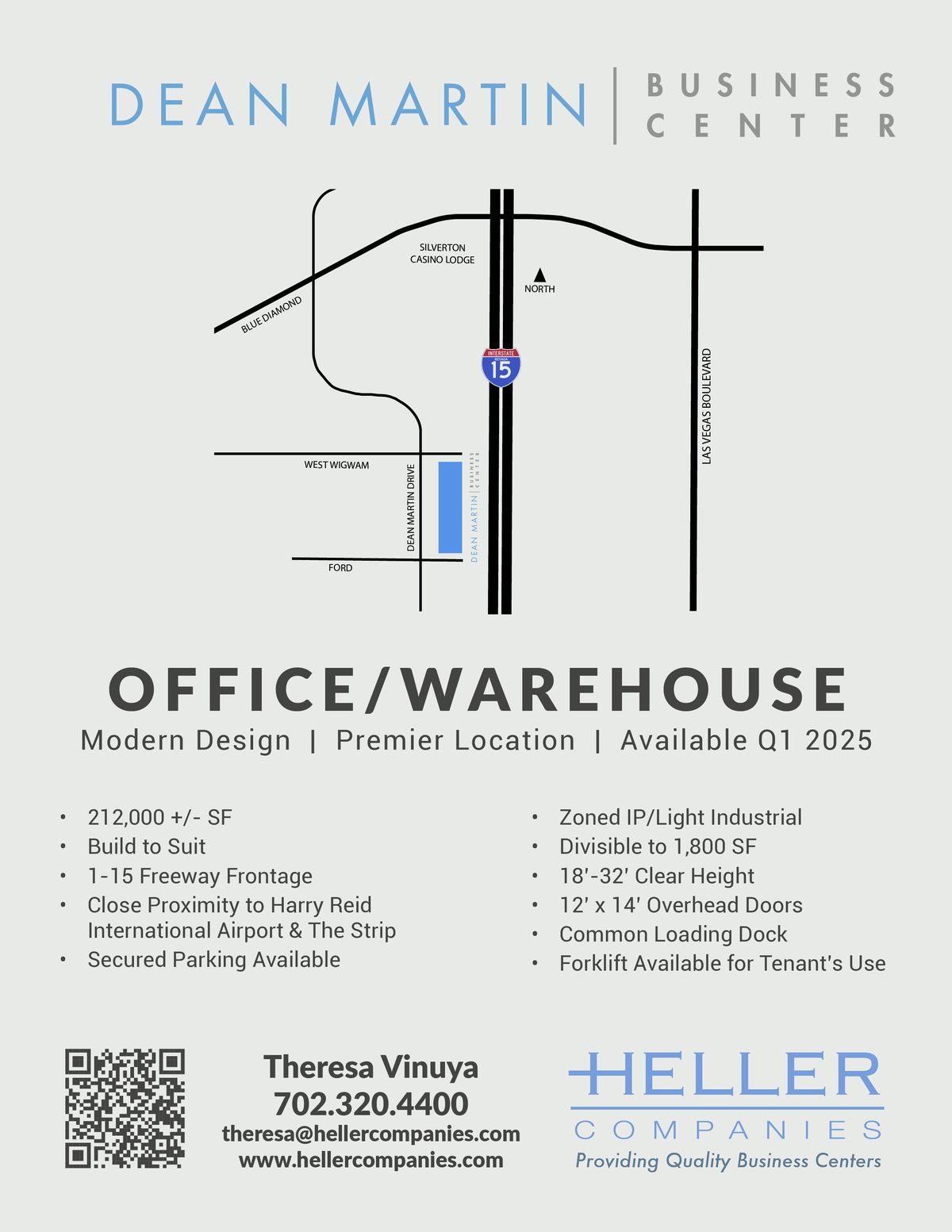 Dean Martin Business Center is an industrial/flex project totaling over 212,000 SQ FT. Strategically located in the southwest submarket with excellent access to the I-15, & I-215 with I-15 freeway visibility. In Close Proximity To The Strip, Harry Reid International Airport, Convention Centers, Dining, Shopping & Hotels.